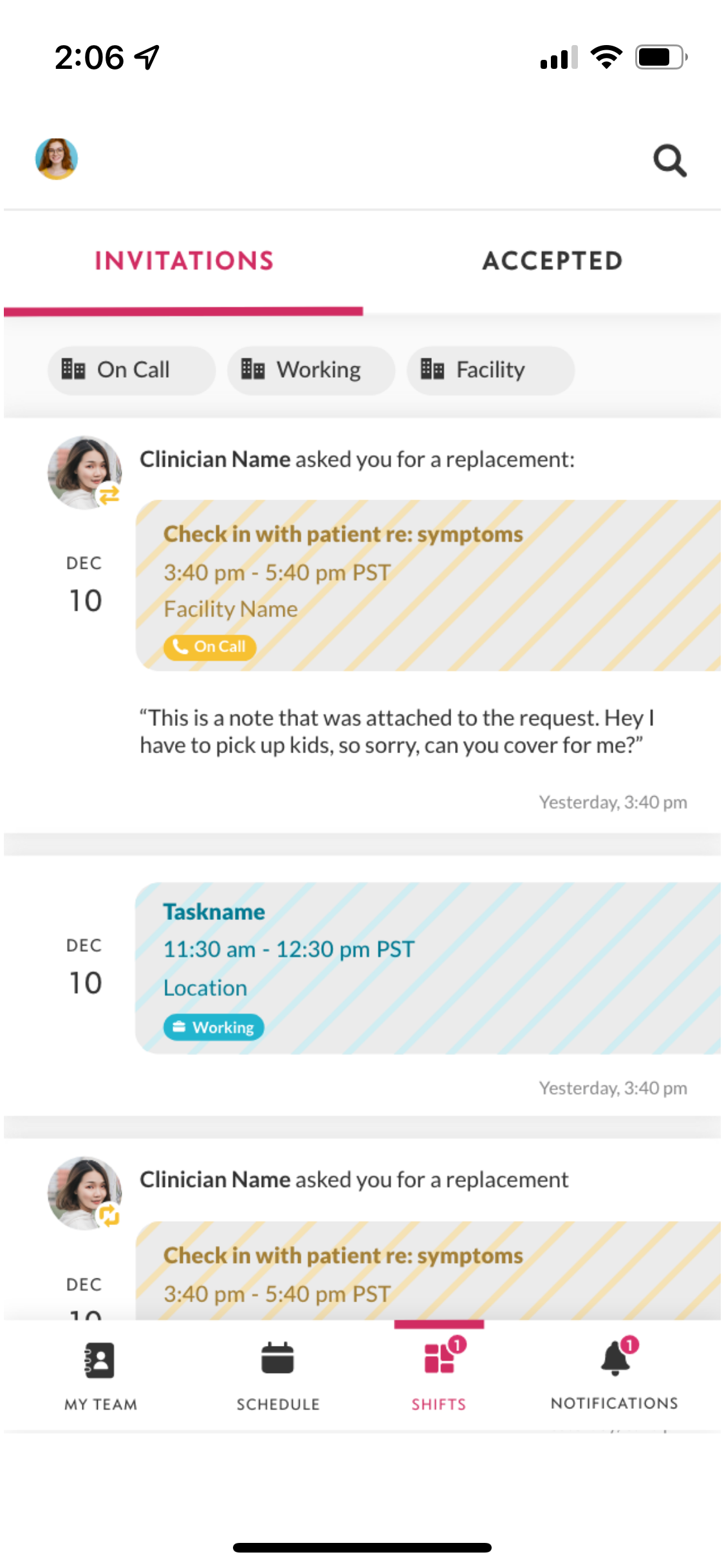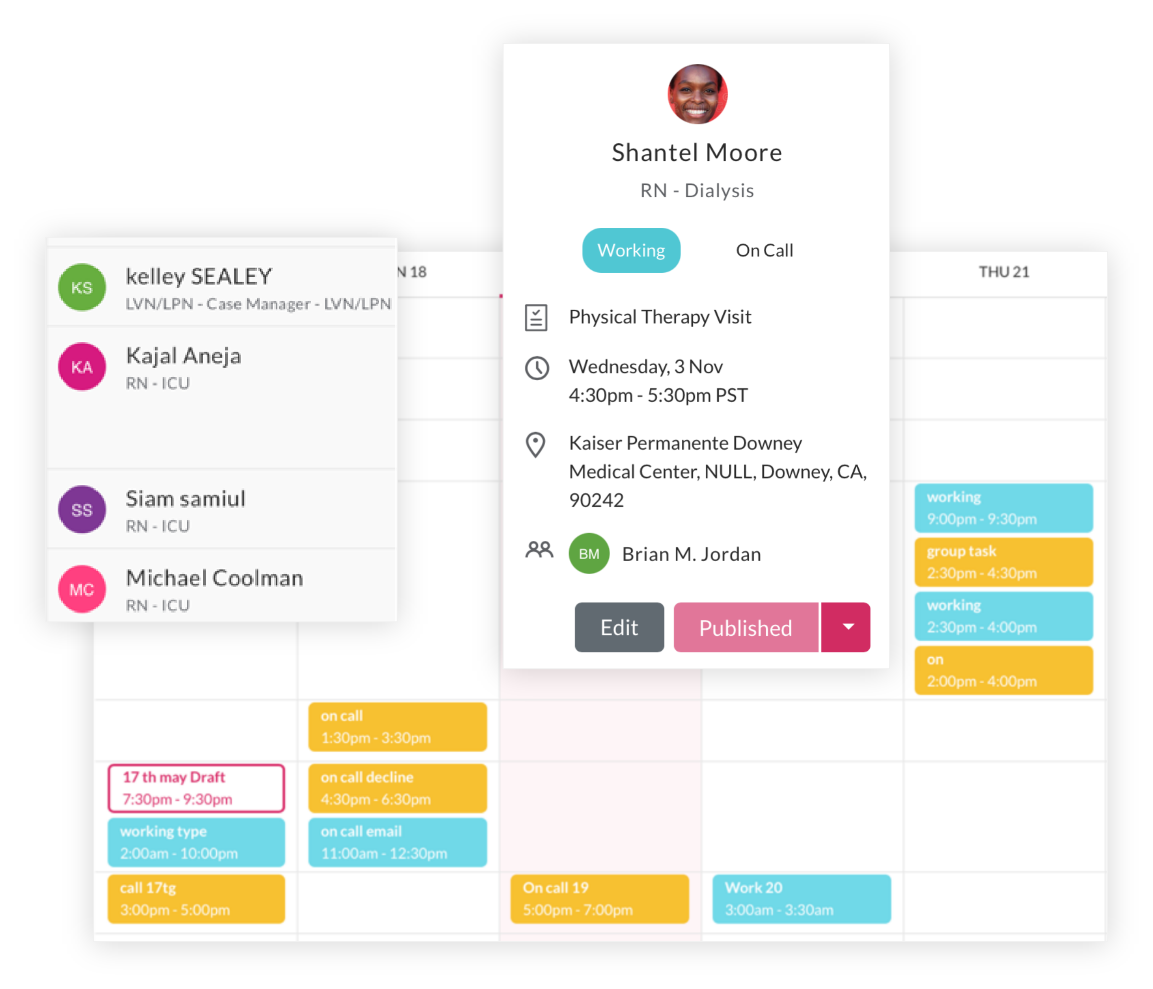 Schedule and manage shifts for clinician appointments while calendar tracking the progress for acceptance or completion.