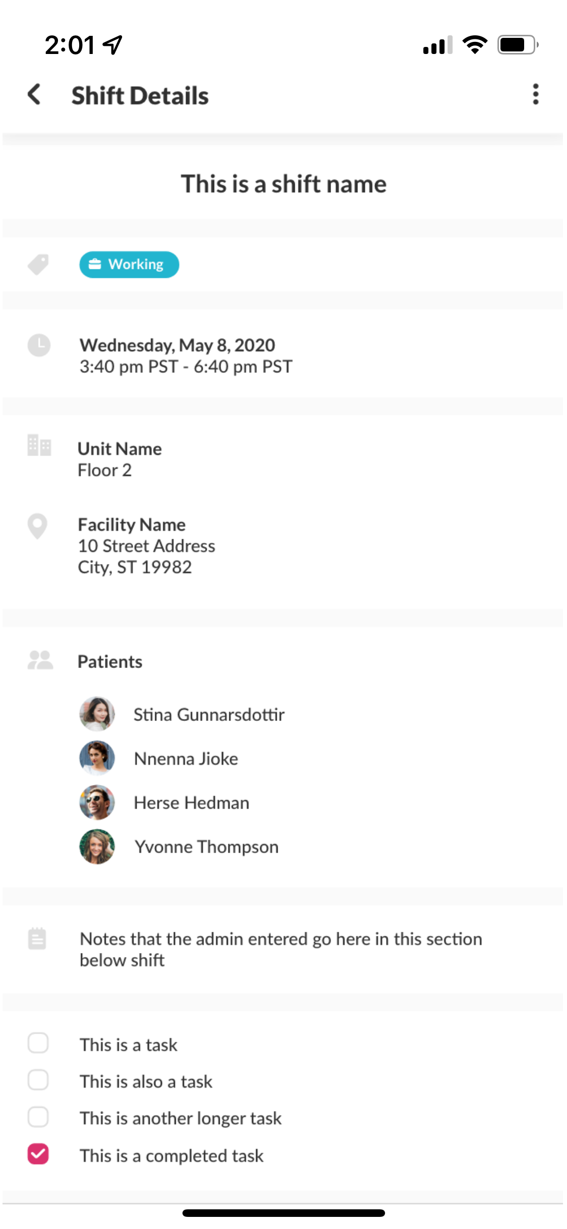 Add individual tasks to shifts and track your clinicians' progress in real time.